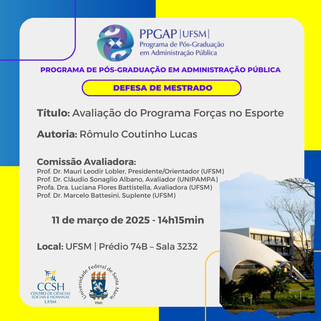 O Programa de Pós-Graduação em Administração Pública divulga a banca de defesa de mestrado do aluno Rômulo Coutinho Lucas, com o título “Avaliação do Programa Forças no Esporte“, que ocorrerá no dia 11 de março de 2025, às 14 horas e 15 minutos, na sala 3232 do prédio 74B, CCSH/UFSM.