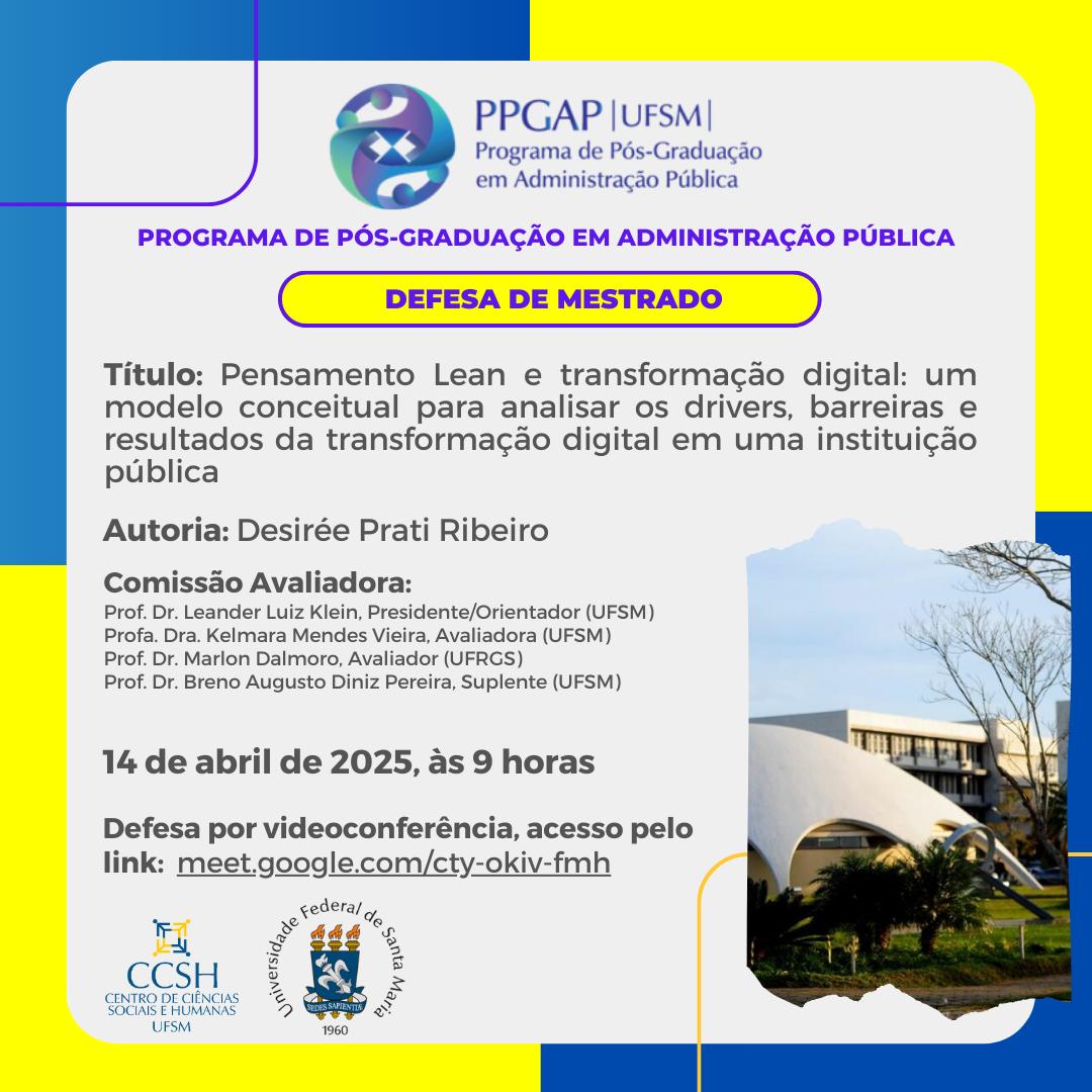 O Programa de Pós-Graduação em Administração Pública divulga a banca de defesa de mestrado da aluna Desirée Prati Ribeiro, com o título “Pensamento Lean e transformação digital: um modelo conceitual para analisar os drivers, barreiras e resultados da transformação digital em uma instituição pública“, que ocorrerá no dia 14 de abril de 2025, às 9 horas por videoconferência, acesso pelo link:  meet.google.com/cty-okiv-fmh