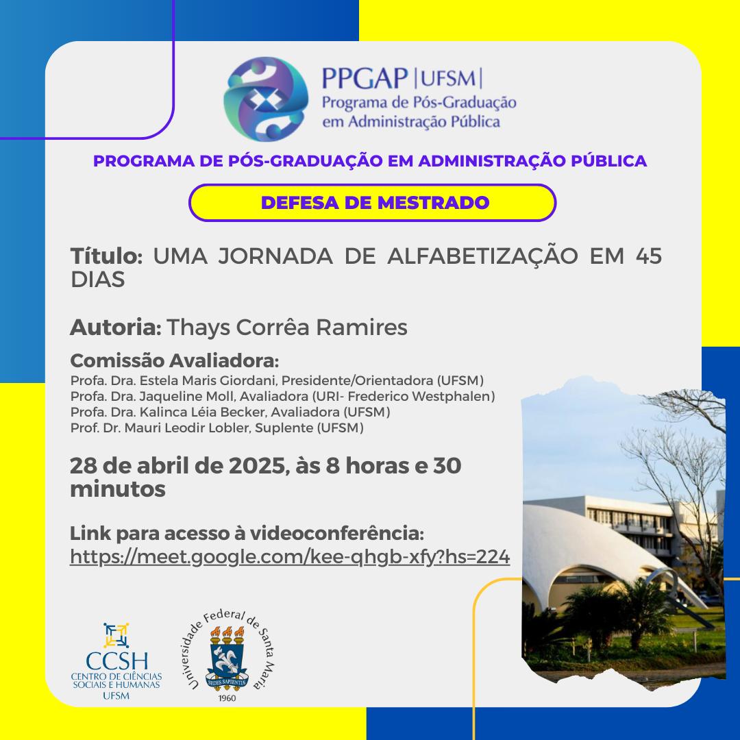 O Programa de Pós-Graduação em Administração Pública divulga a banca de defesa de mestrado da aluna Thays Corrêa Ramires, com o título “UMA JORNADA DE ALFABETIZAÇÃO EM 45 DIAS“, que ocorrerá no dia 28 de abril de 2025, às 8 horas e 30 minutos por videoconferência, acesso pelo link: https://meet.google.com/kee-qhgb-xfy?hs=224