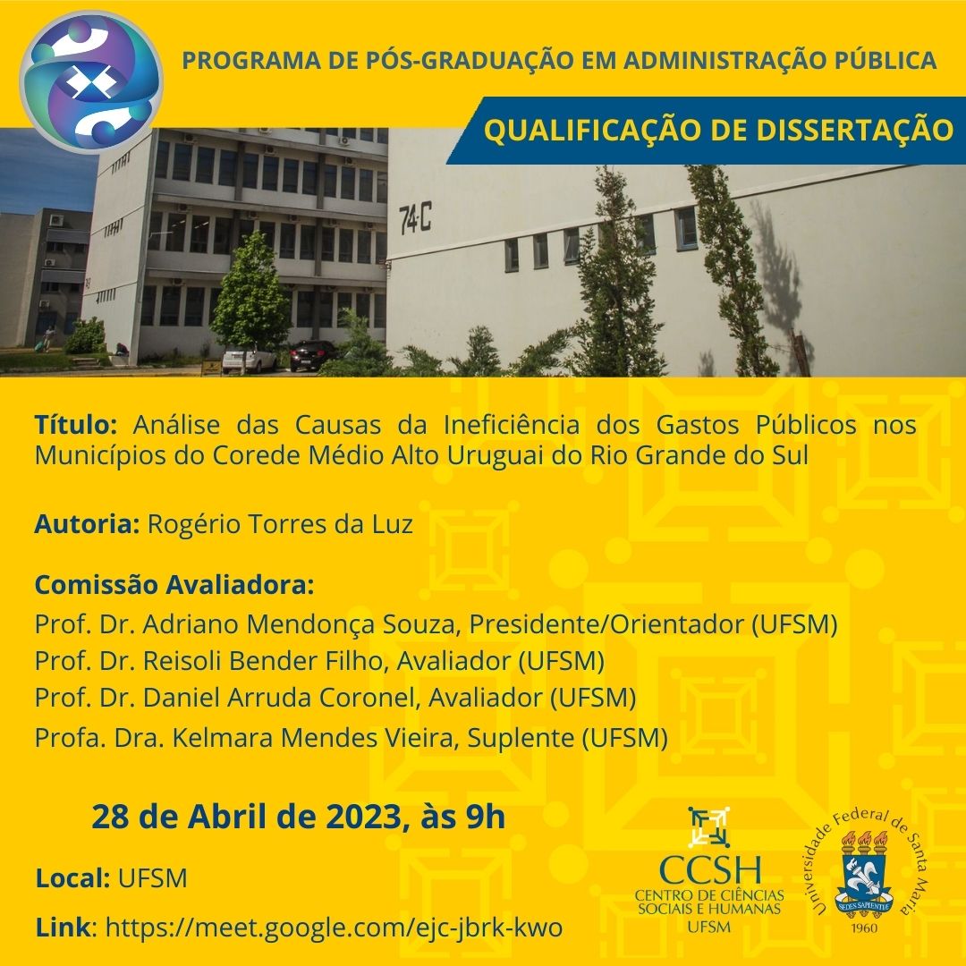 Defesa de Mestrado – Rogério Torres Da LuzO Programa de Pós-Graduação em Administração Pública divulga a banca de defesa de mestrado do aluno Rogério Torres Da Luz, com o título [...]