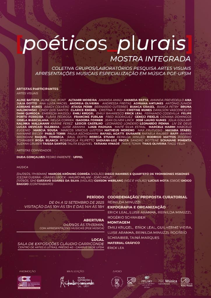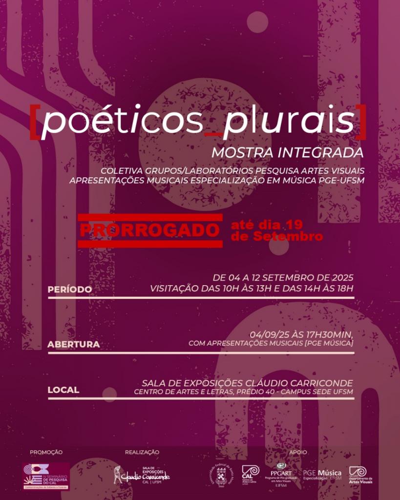 Segue aberta, até dia 19 de setembro, a exposição coletiva Poéticos Plurais, que teve sua abertura durante o evento IV Seminário de Pesquisa do Centro de Artes e Letras, cujo tema girou em torno das contaminações de saberes e fazeres práticos como ponto de discussão e trocas sobre a pesquisa acadêmica. A mostra, com curadoria da professora Reinilda Minuzzi, apresenta parte das pesquisas e produções artísticas realizadas nos Laboratórios de Artes Visuais, contando também com a participação da Especialização em Música da UFSM, que realizou apresentações musicais integradas na programação de abertura da mostra e em outras datas.