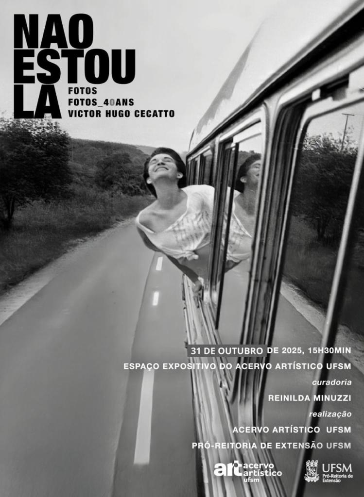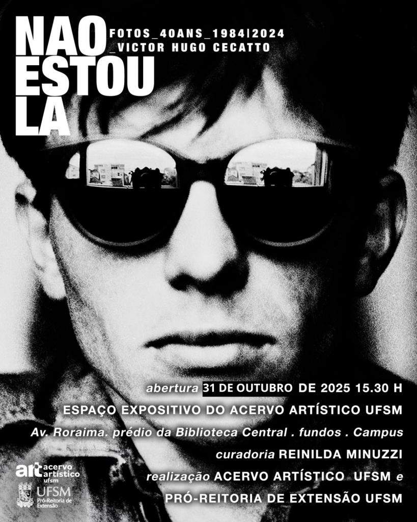 Abriu no dia 31 de outubro de 2025 (sexta-feira), a mostra fotográfica “Não Estou Lá”, do artista Victor Hugo Cecatto, com curadoria da Profª Drª Reinilda Minuzzi (PPGART/UFSM). A mostra se constitui como uma homenagem aos 40 anos de trabalho do artista, que faleceu inesperadamente no começo de 2025. O evento acontece no Acervo Artístico da UFSM e conta com uma abertura no dia 31 de outubro, às 15h30.