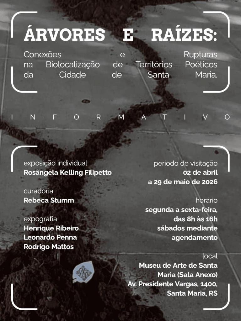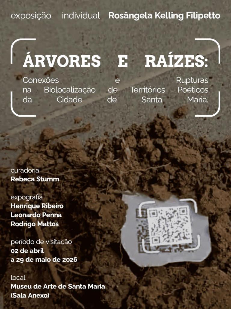 Com início em 2 de abril de 2026, até dia 29 de maio de 2026, a exposição de Rosângela Kelling Filipetto – Árvores e Raizes: Conexões e Rupturas na Biolocalização de Territórios Poéticos da Cidade de Santa Maria estará no MASM – Museu de Arte de Santa Maria, com curadoria de Rebeca Stumm.