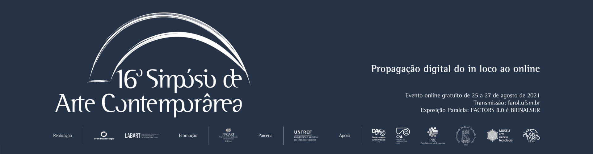 Já estão abertas as inscrições para o 16º Simpósio de Arte Contemporânea. O evento, que acontece anualmente desde 2006, será realizado de 25 a 27 de Agosto, neste ano com o tema Propagação digital – do in loco ao online. O Simpósio reúne professores, pesquisadores e artistas da área em um ciclo de palestras transdisciplinar aberto a estudantes e público em geral. Pelo segundo ano consecutivo, o evento será totalmente online, devido à pandemia de Covid- 19. As inscrições são gratuitas e podem ser feitas através do link forms.gle/igijZr6iBRU76iqE9. O Simpósio é uma realização do Laboratório de Arte Contemporânea, Tecnologia e Mídias Digitais (LABART) com promoção do Programa de Pós-Graduação em Artes Visuais (PPGART) e apoio da Pró-reitoria de Extensão (PRE).