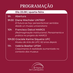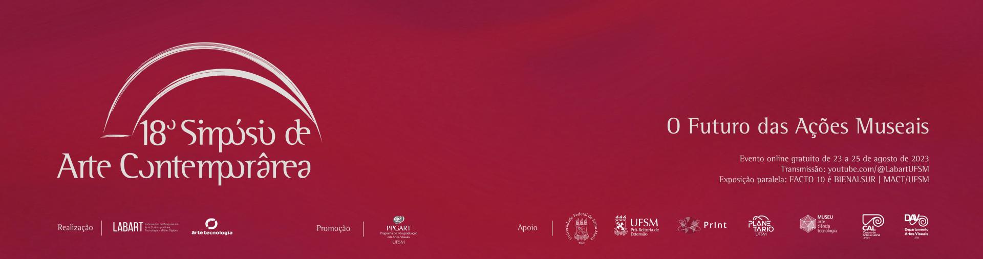 O 18° Simpósio de Arte Contemporânea acontece nas manhãs do dia 23/08 ao dia 25/08, das 9:00 às 12:00, online! Nos 3 dias estaremos todos acompanhados de palestrantes do Brasil (das cidades de Belo Horizonte, Brasília, Campinas, Fortaleza, Porto Alegre, São Paulo e Santa Maria) Argentina (Buenos Aires), Espanha (Madri), México (CDM) e EUA (Providence, Rhode Island). Eles vão compartilhar suas perspectivas acerca da temática do Futuro das Ações Museais em contextos que perpassam a curadoria, memória, pensamento científico e arte contemporânea, realidade aumentada, projetos e processos em museus universitários nacionais e internacionais.