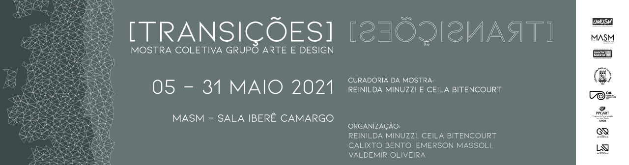 Transições, mostra coletiva do Grupo Arte e Design, tem como proposta a apresentação de produções artísticas envolvendo processos híbridos, nas quais os artistas abordam a mescla de linguagens e meios, entrecruzando processos e campos de ação/atuação, que se orientam em torno dos conceitos, práticas e poéticas de cada artista.