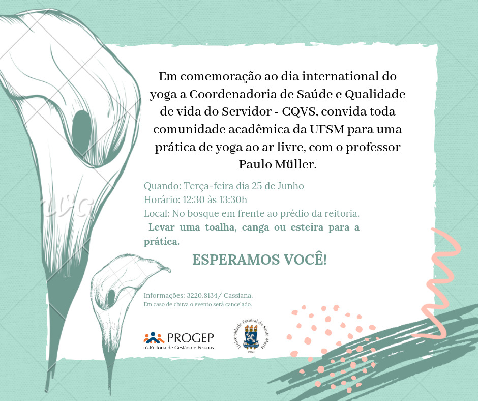 A Coordenadoria de Saúde e Qualidade de Vida do Servidor – CQVS/ UFSM, convida Docentes, TAES, Discentes e comunidade em geral para participar de uma aula de yoga ao ar livre.