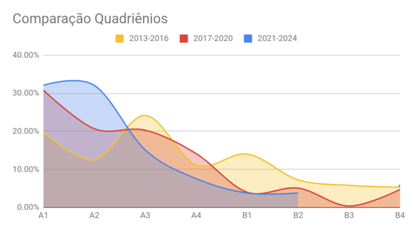 O PPGBA tem se destacado nos últimos anos pelo aumento, tanto da quantidade como da qualidade, dos artigos publicados pelos professores e alunos do Programa. Considerando o Novo Qualis Capes (2019), o resultado indica uma clara mudança no perfil de publicação de artigos do PPGBA a partir do quadriênio 2017-2020, onde a maioria dos artigos está no estrato Qualis A. Notavelmente, o resultado indica claramente que a vasta maioria da produção do ano de 2021 (Quadriênio 2021-2024) também se encontra no estrato Qualis A.