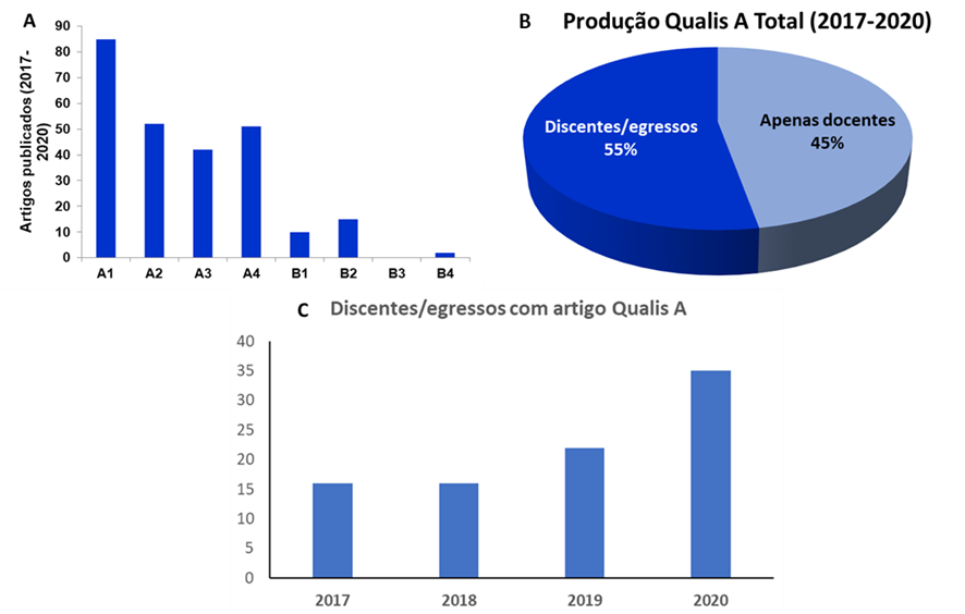 Ao considerarmos o período do quadriênio 2017-2020, foram importados para a Plataforma Sucupira 269 artigos publicados pelos docentes do Programa. Considerando o Novo Qualis Capes 2019, 231 (86%) desses artigos encontram-se no estrato superior (A4+). Destes 231 artigos, 141 (61%) possuem discentes ou egressos como autores, sendo 44 A1 (31,4%), 33 A2 (23,3%), 31 A3 (22%) e 33 A4 (23,3%). Além desses dados, é muito importante destacar o expressivo crescimento do número de discentes/egressos com artigo Qualis A publicado neste quadriênio: 2017 = 16; 2018 = 18; 2019 = 22; e 2020 = 35.
