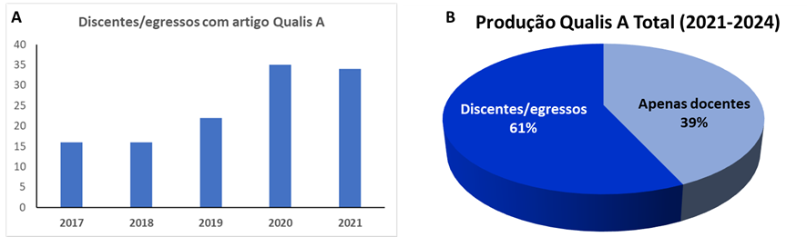 - Percentual de produção Qualis A de discentes/egressos e de apenas docentes no ano de 2021 (Quadriênio 2021-2024).