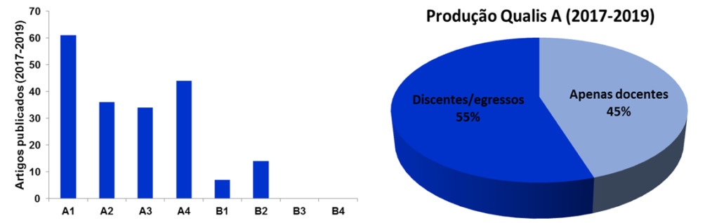 Ao considerarmos o período do quadriênio 2017-2020, foram importados para a Plataforma Sucupira 269 artigos publicados pelos docentes do Programa. Considerando o Novo Qualis Capes 2019, 231 (86%) desses artigos encontram-se no estrato superior (A4+). Destes 231 artigos, 141 (61%) possuem discentes ou egressos como autores, sendo 44 A1 (31,4%), 33 A2 (23,3%), 31 A3 (22%) e 33 A4 (23,3%). Além desses dados, é muito importante destacar o expressivo crescimento do número de discentes/egressos com artigo Qualis A publicado neste quadriênio: 2017 = 16; 2018 = 18; 2019 = 22; e 2020 = 35.