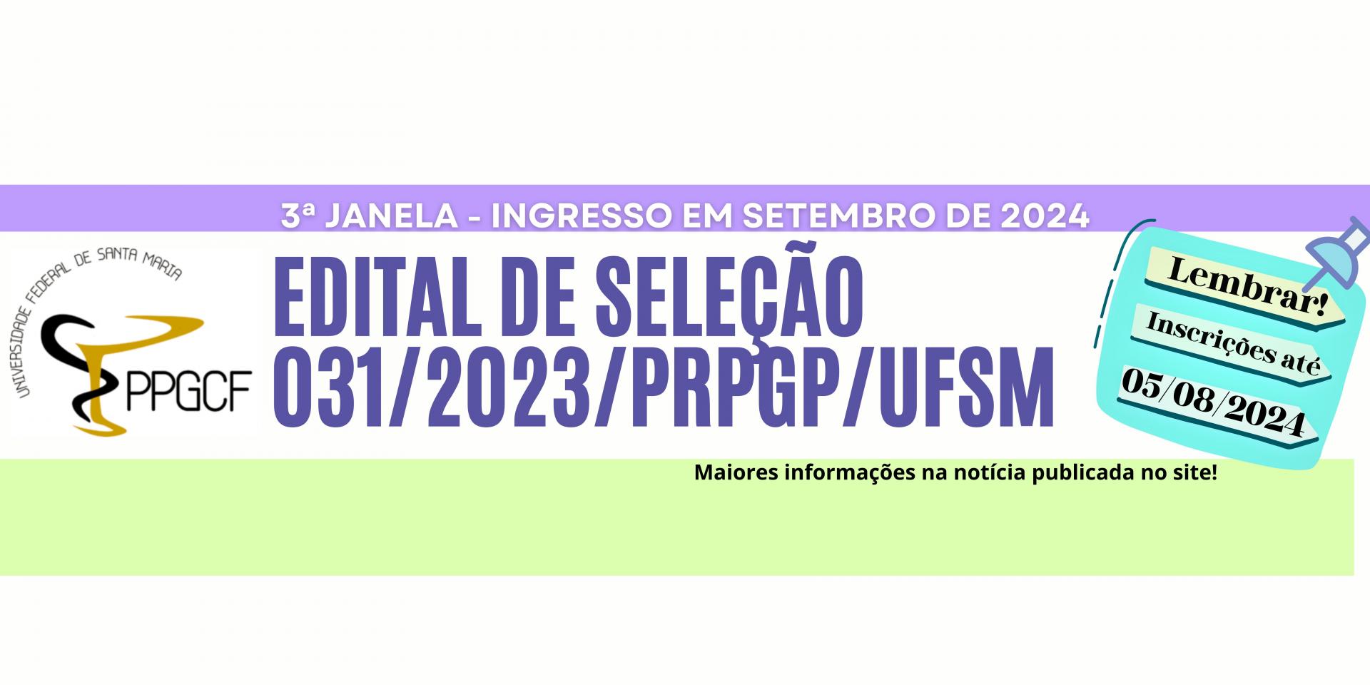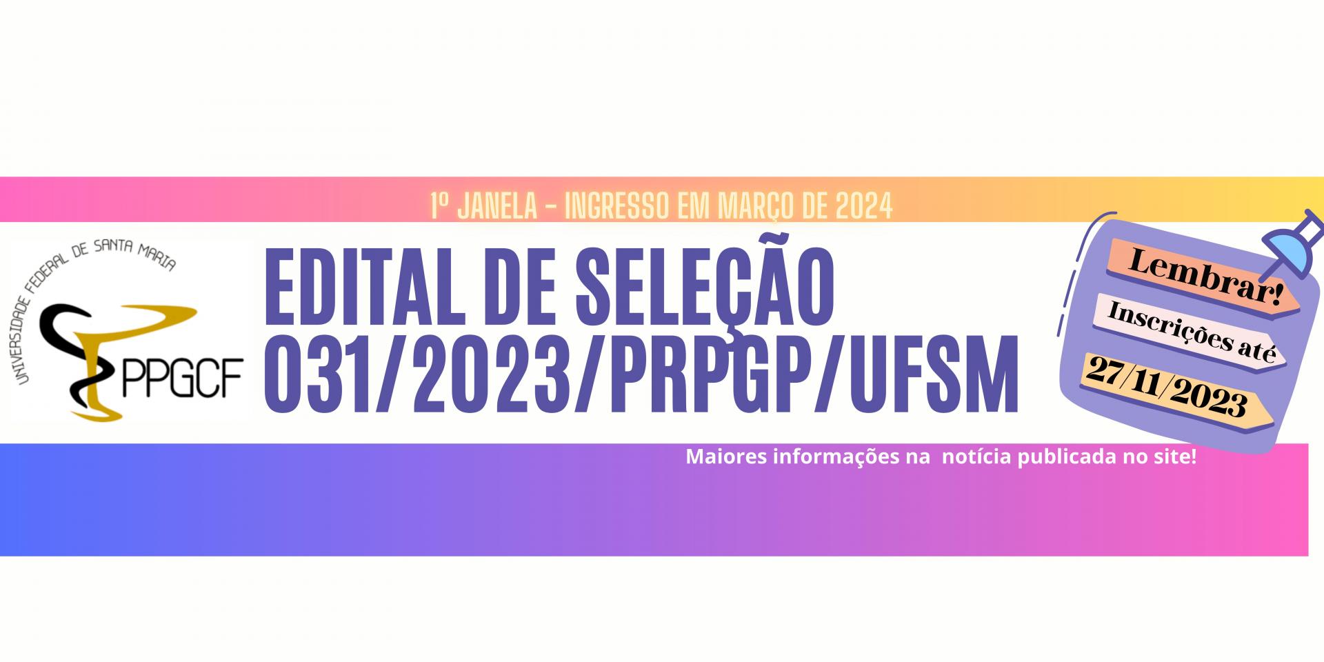 Edital de bolsas para o mestrado nº 05/2024 – PPGCFNo período citado abaixo, estarão abertas as inscrições para seleção de bolsistas do PPGCF/UFSM. • Período de inscrições: de 08/10/2024 a 10/10/2024• [...]