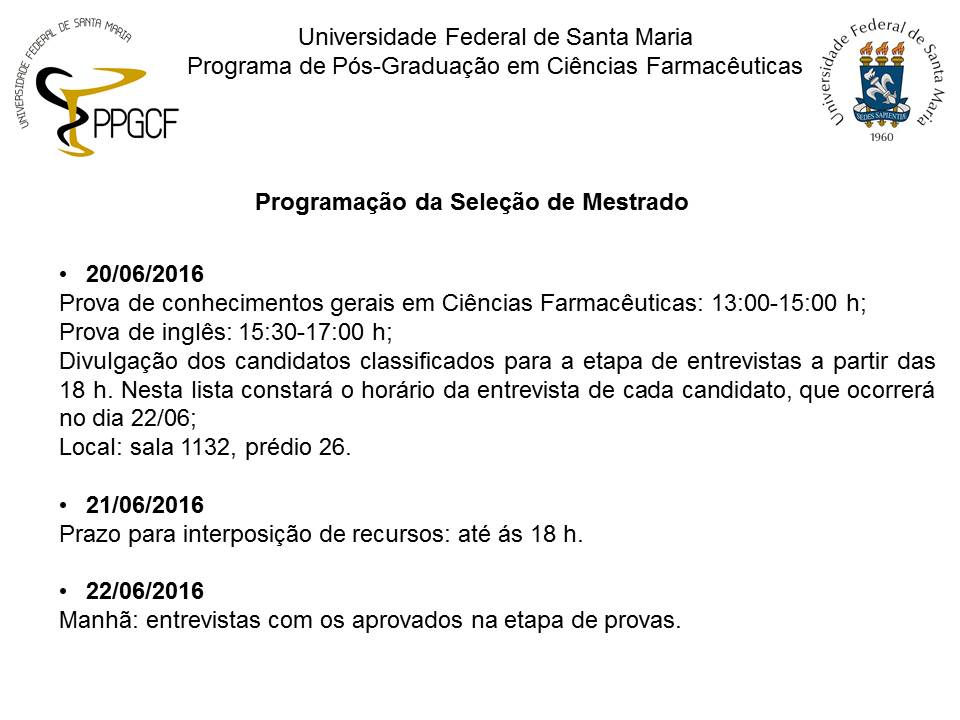 Seleção PNPD – EntrevistaData e horário da entrevista: 07/10/2016 às 13h30min na secretaria do PPGCF, sala 1132.