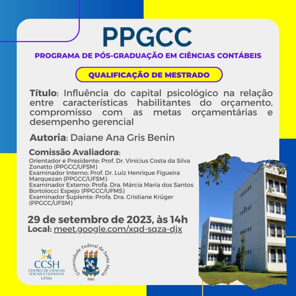 O Programa de Pós-Graduação em Ciências Contábeis divulga a banca de qualificação de mestrado da aluna Daiane Ana Gris Benin, com o título “Influência do capital psicológico na relação entre características habilitantes do orçamento, compromisso com as metas orçamentárias e desempenho gerencial” que ocorrerá no dia 29 de Setembro, às 14 horas.