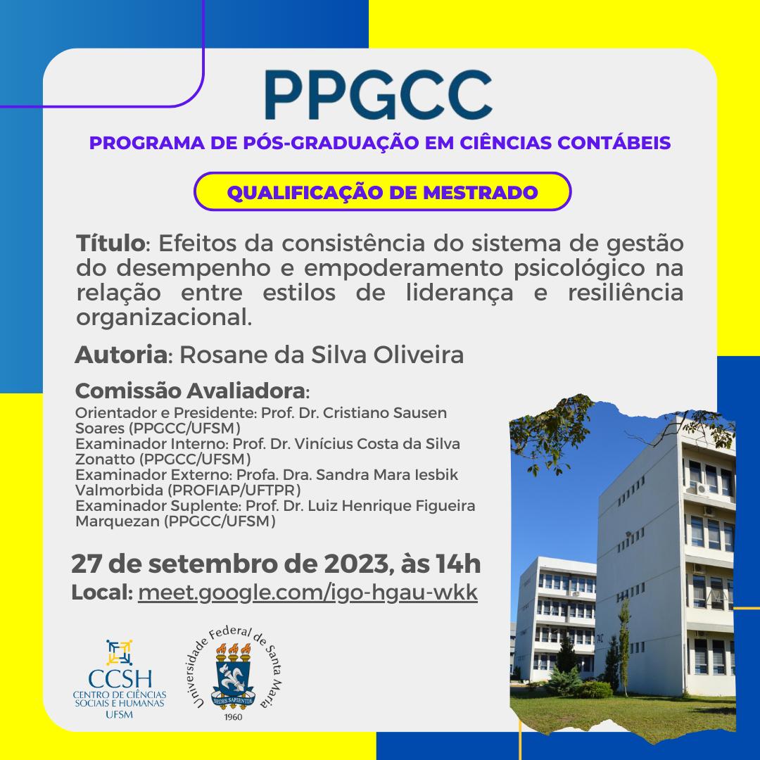 O Programa de Pós-Graduação em Ciências Contábeis divulga a banca de qualificação de mestrado da aluna Rosane da Silva Oliveira, com o título “Efeitos da consistência do sistema de gestão do desempenho e empoderamento psicológico na relação entre estilos de liderança e resiliência organizacional” que ocorrerá no dia 27 de Setembro, às 14 horas.