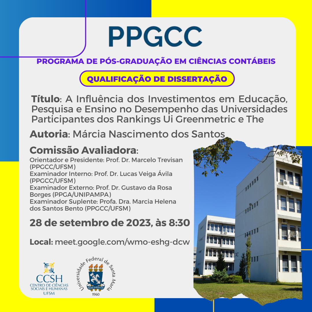 O Programa de Pós-Graduação em Ciências Contábeis divulga a banca de qualificação de mestrado da aluna Márcia Nascimento dos Santos, com o título “A Influência dos Investimentos em Educação, Pesquisa e Ensino no Desempenho das Universidades Participantes dos Rankings Ui Greenmetric e The”, que ocorrerá no dia 28 de setembro, às 8h30min, na UFSM. Link para acesso à videoconferência: https://meet.google.com/wmo-eshg-dcw.