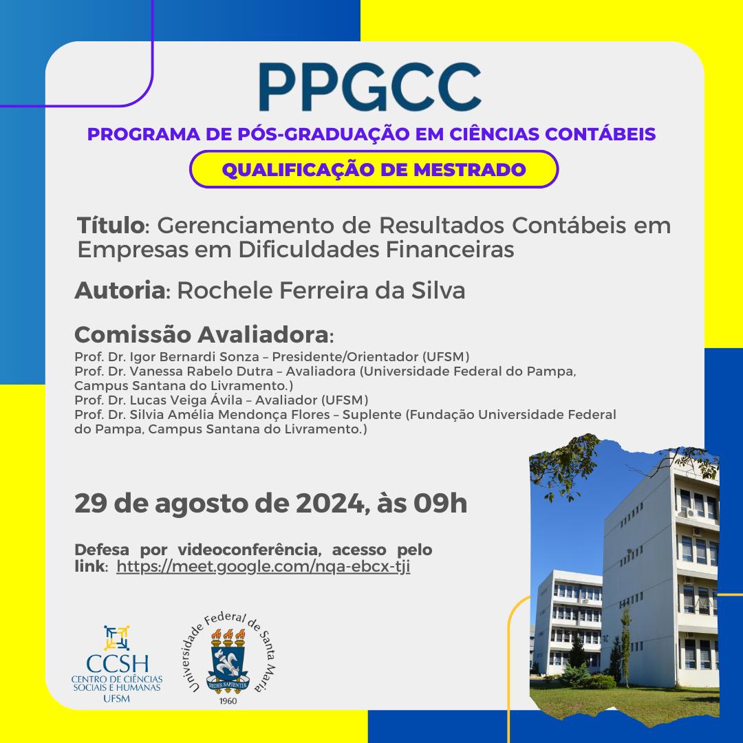 O Programa de Pós-Graduação em Ciências Contábeis divulga a banca de qualificação de mestrado da aluna Rochele Ferreira da Silva, com o título “Gerenciamento de Resultados Contábeis em Empresas em Dificuldades Financeiras” , que ocorrerá no dia 29 de agosto de 2024, às 09 horas.