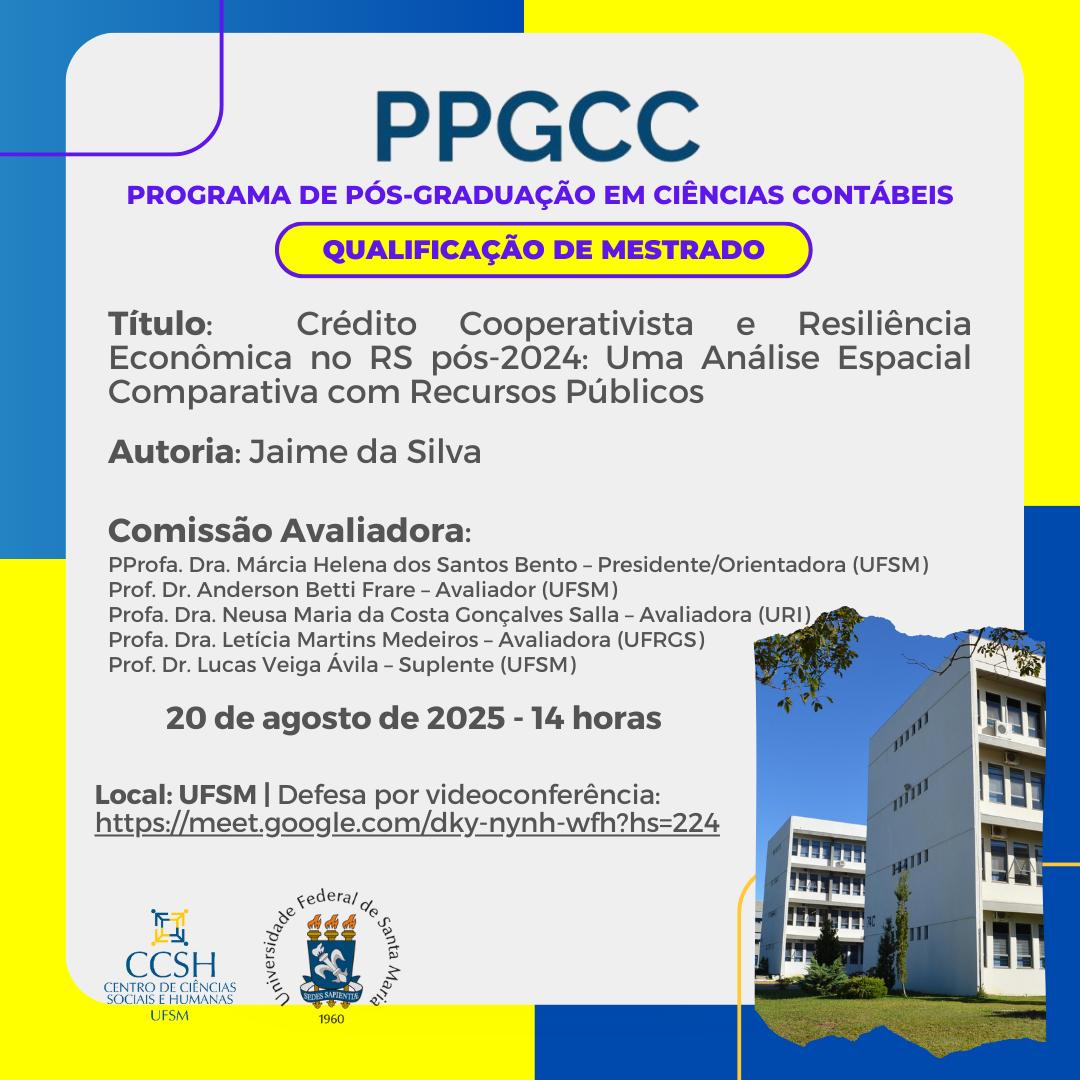 O Programa de Pós-Graduação em Ciências Contábeis divulga a banca de qualificação de mestrado do aluno Jaime da Silva, com o título “ Crédito Cooperativista e Resiliência Econômica no RS pós-2024: Uma Análise Espacial Comparativa com Recursos Públicos” , que ocorrerá no dia 20 de agosto de 2025 às 14 horas.