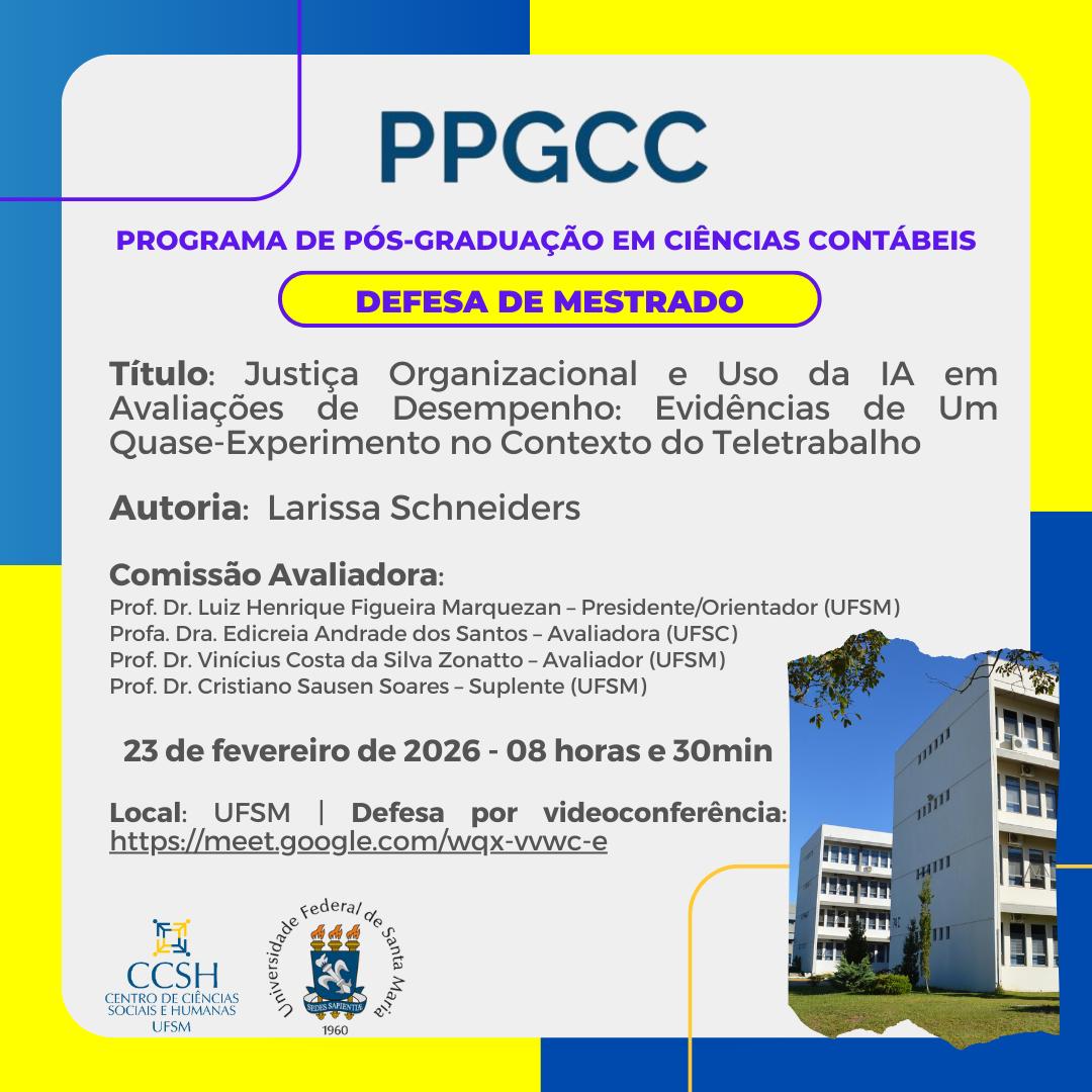 O Programa de Pós-Graduação em Ciências Contábeis divulga a banca de defesa de mestrado da aluna Larissa Schneiders , com o título “Justiça Organizacional e Uso da IA em Avaliações de Desempenho: Evidências de Um Quase-Experimento no Contexto do Teletrabalho”, que ocorrerá no dia 23 de fevereiro de 2026, às 08 horas e 30 min.