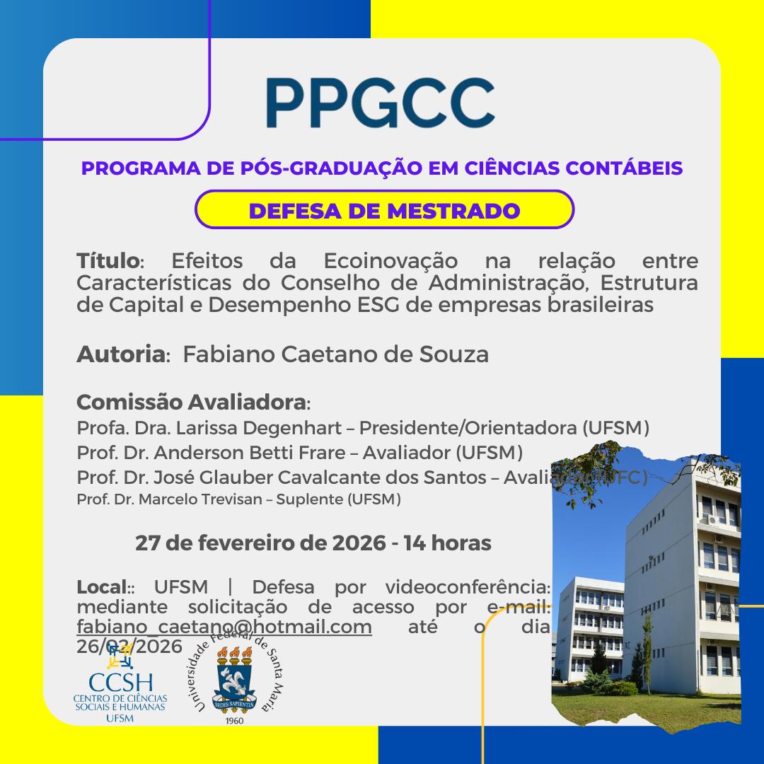O Programa de Pós-Graduação em Ciências Contábeis divulga a banca de defesa de mestrado do aluno Fabiano Caetano de Souza , com o título “Efeitos da Ecoinovação na relação entre Características do Conselho de Administração, Estrutura de Capital e Desempenho ESG de empresas brasileiras”, que ocorrerá no dia 27 de fevereiro de 2026, às 14 horas.