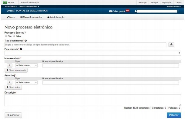 Ao completar os campos da tela inicial (acima), SALVAR o processo, e avançar para a inclusão dos documentos. O processo já está criado e já possui um NUP (Número Único de Protocolo).