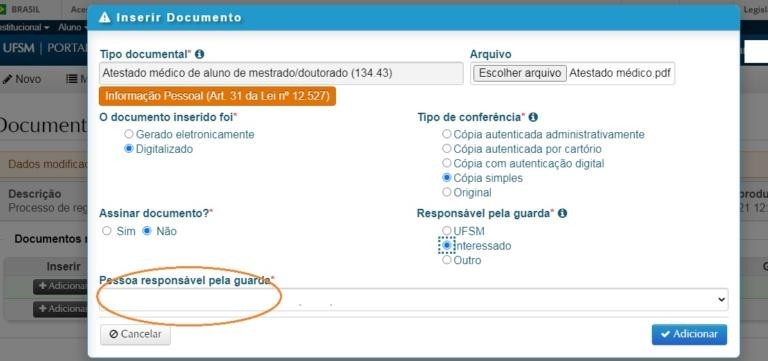 Na opção de ‘Pessoa responsável pela guarda’ deve ser indicado quem tem a guarda do documento original utilizado, ou seja, nome do aluno, sendo que as opções que vêm preenchidas podem ser alteradas conforme necessidade.