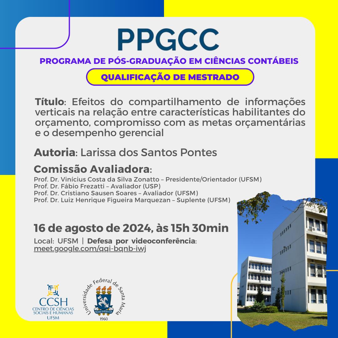 O Programa de Pós-Graduação em Ciências Contábeis divulga a banca de qualificação de mestrado da aluna Larissa dos Santos Pontes, com o título “Efeitos do compartilhamento de informações verticais na relação entre características habilitantes do orçamento, compromisso com as metas orçamentárias e o desempenho gerencial” , que ocorrerá no dia 16 de agosto de 2024, às 15 horas e 30 minutos.