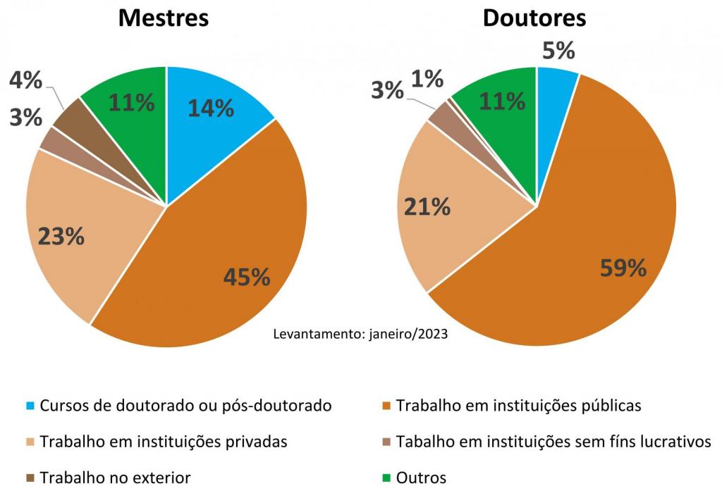 - No caso dos mestres formados pelo PPGCS, os principais destinos são a atuação profissional como técnicos ou docentes em instituições públicas (51%) e atuação profissional em entidades privadas (26%). Mestrandos que continuam os estudos em cursos de doutorado perfazem 7% e os que trabalham no exterior são 6%.