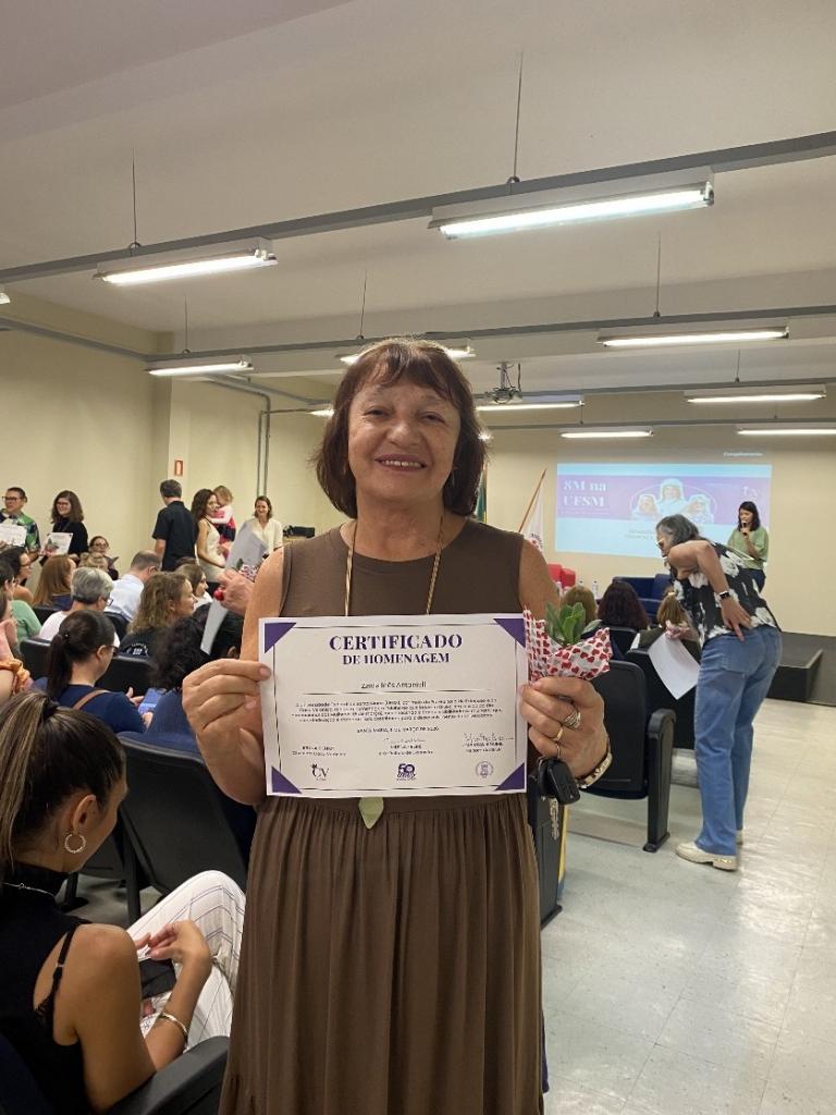 Zaida Inês Antoniolli Homenagem: Mulheres que fazem a UFSM Santa Maria-RS, 2026. A professora Zaida recebeu a homenagem representando o Centro de Ciências Rurais (CCR), pela sua dedicação e compromisso na gestão, ensino, pesquisa e extensão para o desenvolvimento da UFSM/Santa Maria/RS. A homenagem concedida pela Pró-reitoria de Extensão e Casa Verônica, em alusão ao Dia Internacional das Mulheres. |
