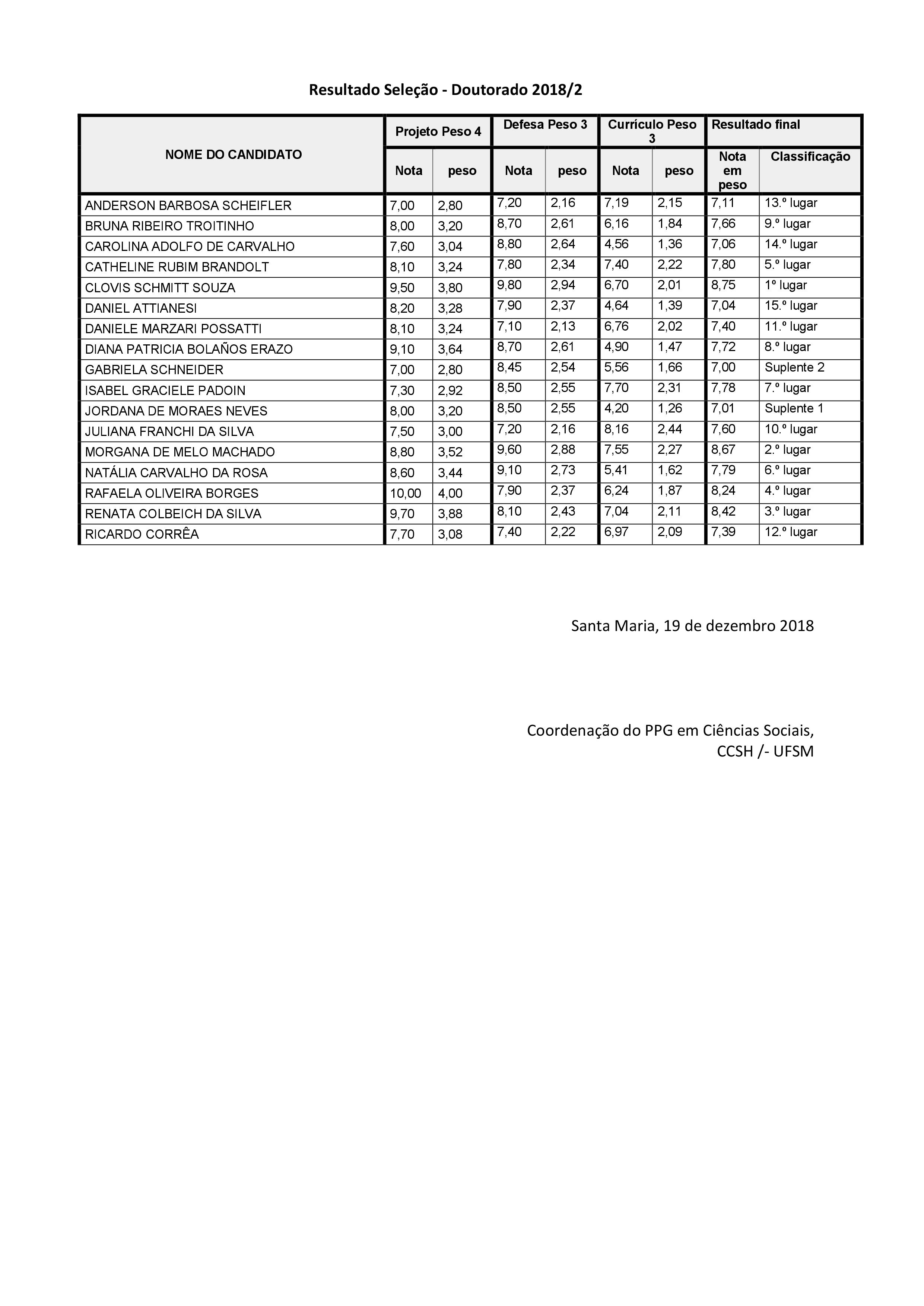 Resultado final Seleo Mestrado 2018-2 para Ingresso 2019-1 Cincias Sociais Resultado final Seleo doutorado 2018-2 para ingresso 2019-1 Cincias Sociais