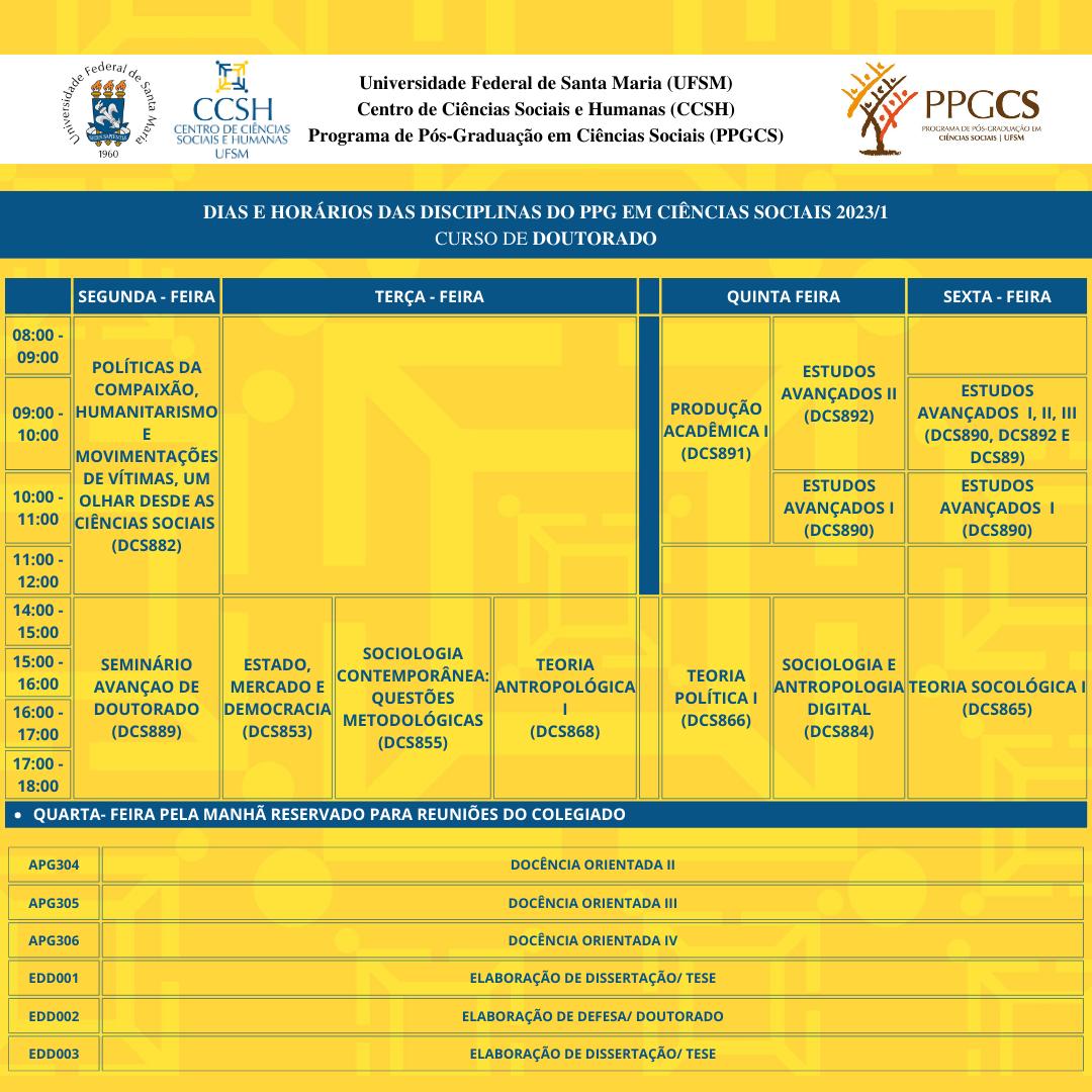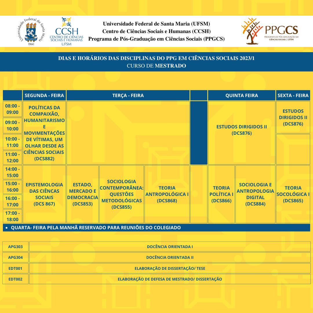 O Programa de Pós-Graduação em Ciências Sociais divulga os horários e dias das disciplinas dos Cursos de Mestrado e Doutorado em Ciências Sociais de 2023/1