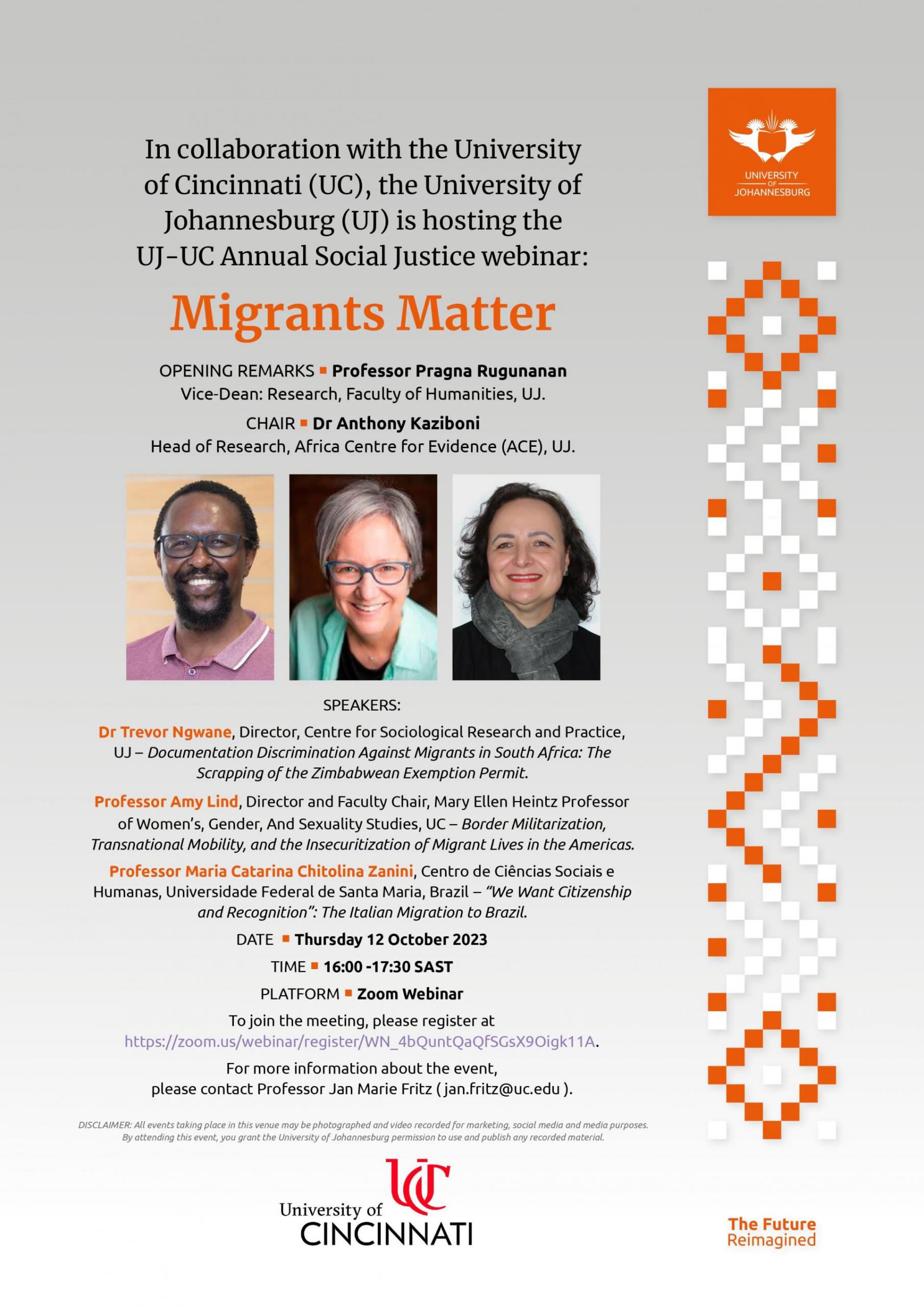O Programa de Pós-graduação em Ciências Sociais informa a comunidade acadêmica sobre a Participação da Profa. Dra. Maria Catarina Zanini do PPG em Ciências Sociais da UFSM no Seminário Internacional – Webinar Anual sobre justiça social da UJ-UC: Migrants Matter, cuja participação é resultado da parceria entre o PPGCSociais/UFSM e a University of Cincinnati