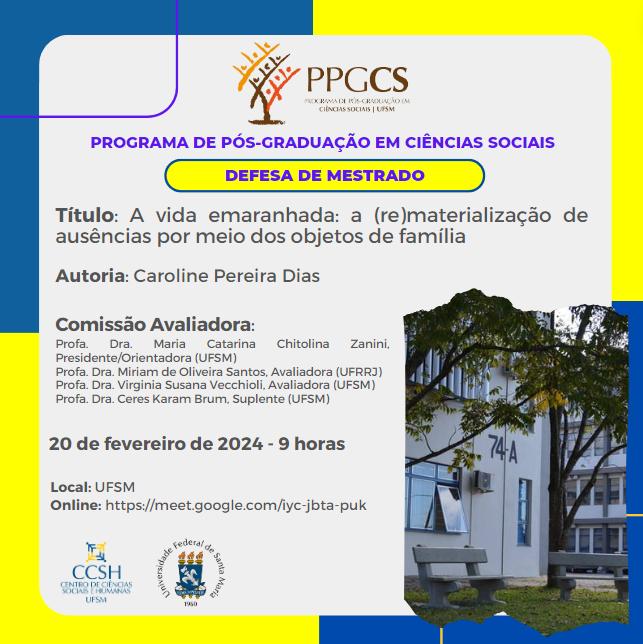 O Programa de Pós-Graduação em Ciências Sociais divulga a banca de defesa de mestrado da aluna Caroline Pereira Dias, com o título “A vida emaranhada: a (re)materialização de ausências por meio dos objetos de família“, que ocorrerá no dia 20 de fevereiro, às 9 horas, na UFSM. Link para acesso à videoconferência: https://meet.google.com/iyc-jbta-puk.