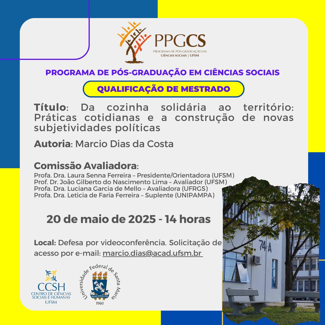 O Programa de Pós-Graduação em Ciências Sociais divulga a banca de qualificação de mestrado do aluno Marcio Dias da Costa, com o título “Da cozinha solidária ao território: Práticas cotidianas e a construção de novas subjetividades políticas“, que ocorrerá no dia 20 de maio de 2025, às 14 horas.