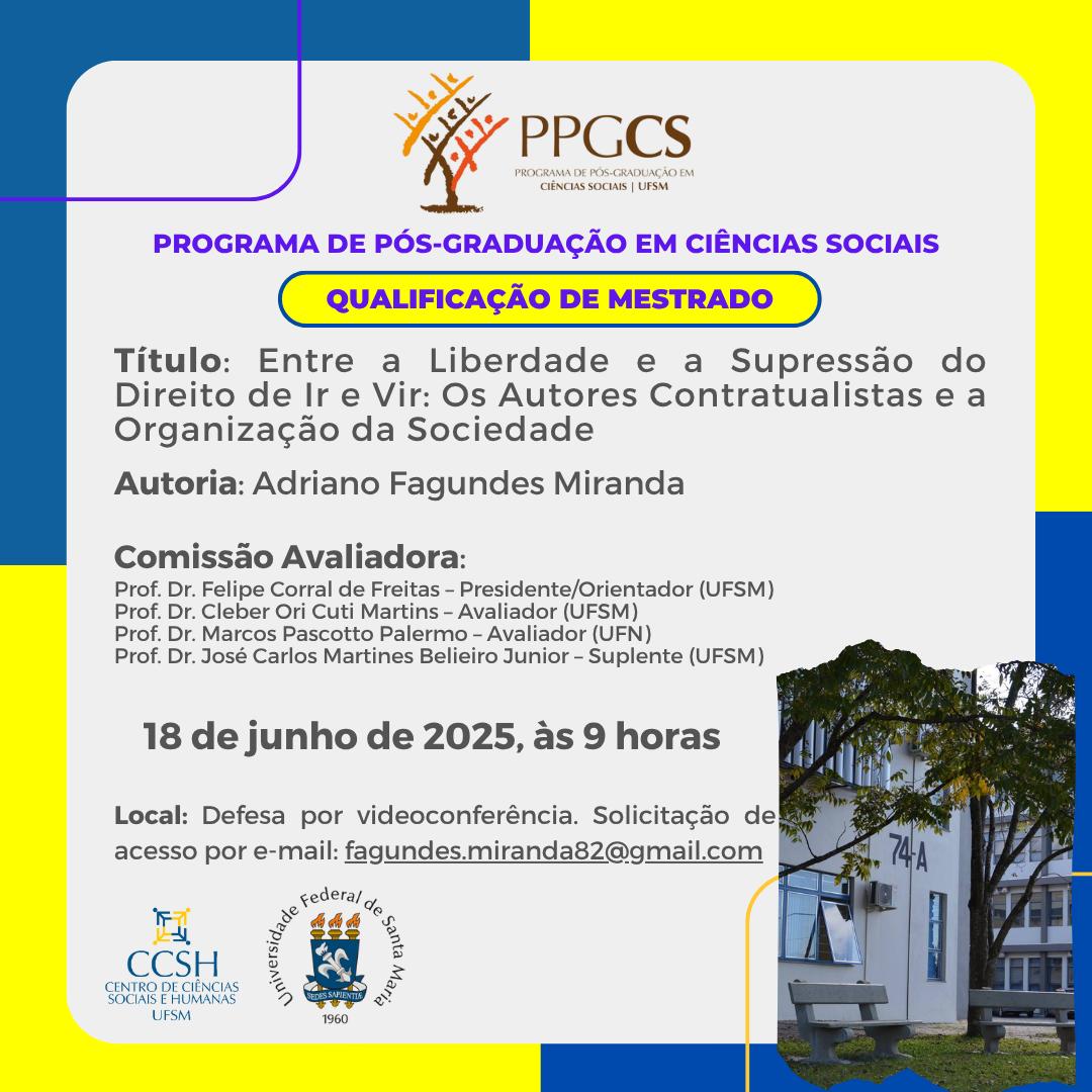 O Programa de Pós-Graduação em Ciências Sociais divulga a banca de qualificação de mestrado do aluno Adriano Fagundes Miranda, com o título “Entre a Liberdade e a Supressão do Direito de Ir e Vir: Os Autores Contratualistas e a Organização da Sociedade“, que ocorrerá no dia 18 de junho de 2025, às 9 horas.