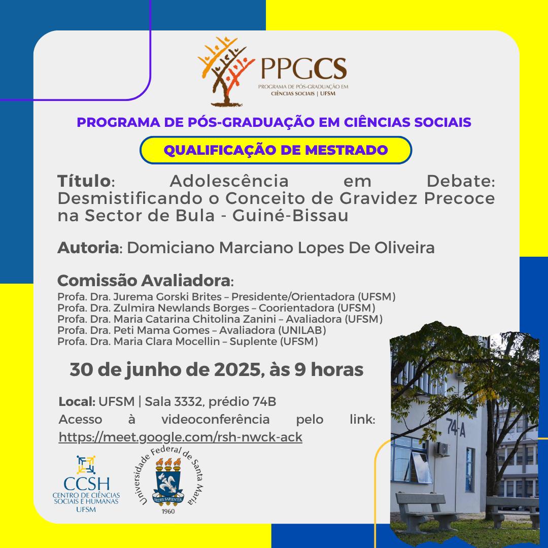 O Programa de Pós-Graduação em Ciências Sociais divulga a banca de qualificação de mestrado do aluno Domiciano Marciano Lopes De Oliveira, com o título: “Adolescência em Debate: Desmistificando o Conceito de Gravidez Precoce na Sector de Bula – Guiné-Bissau”, a ser realizada no dia 30 de junho de 2025, às 9 horas, de forma híbrida, na sala 3332 do prédio 74B.