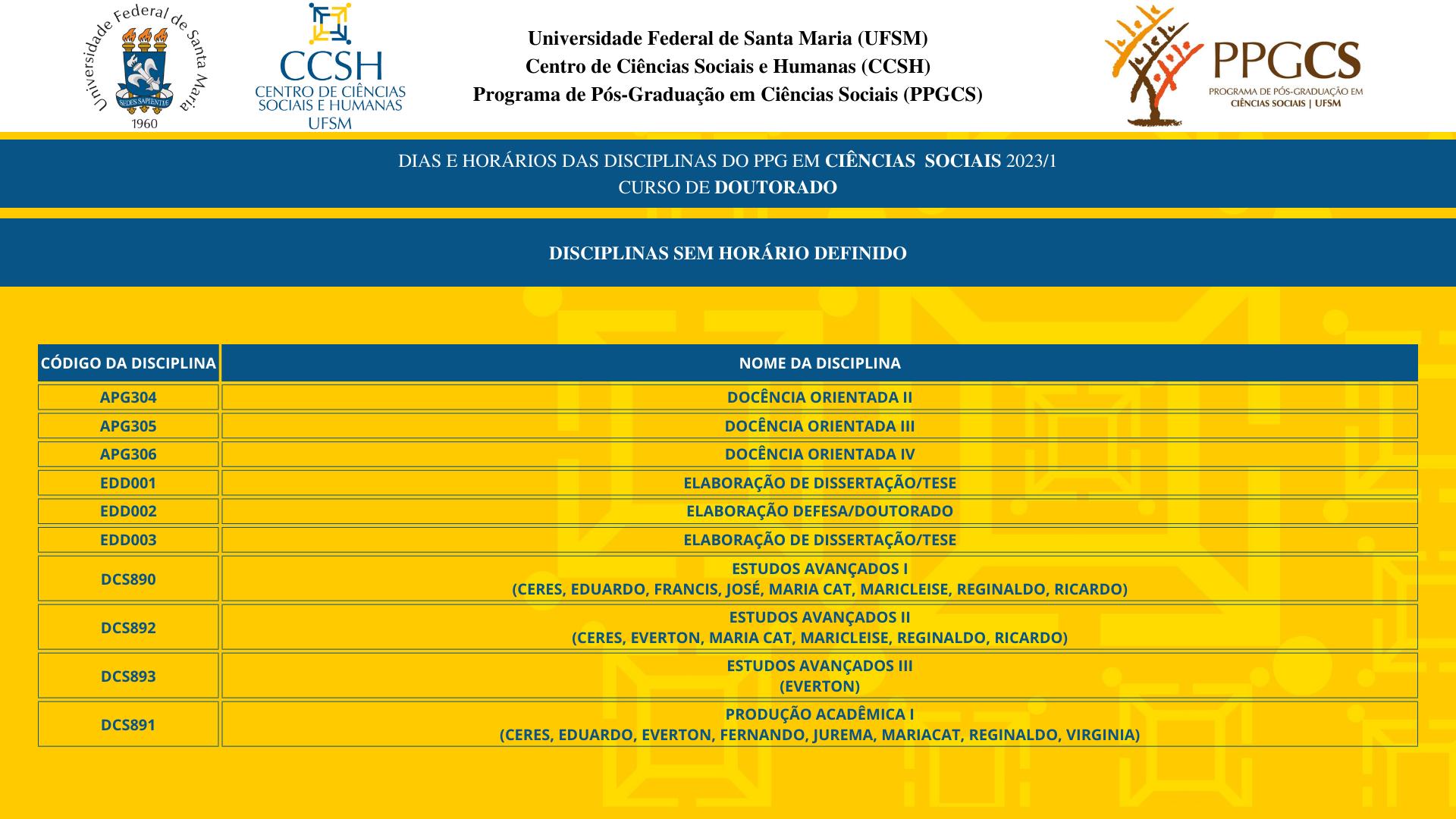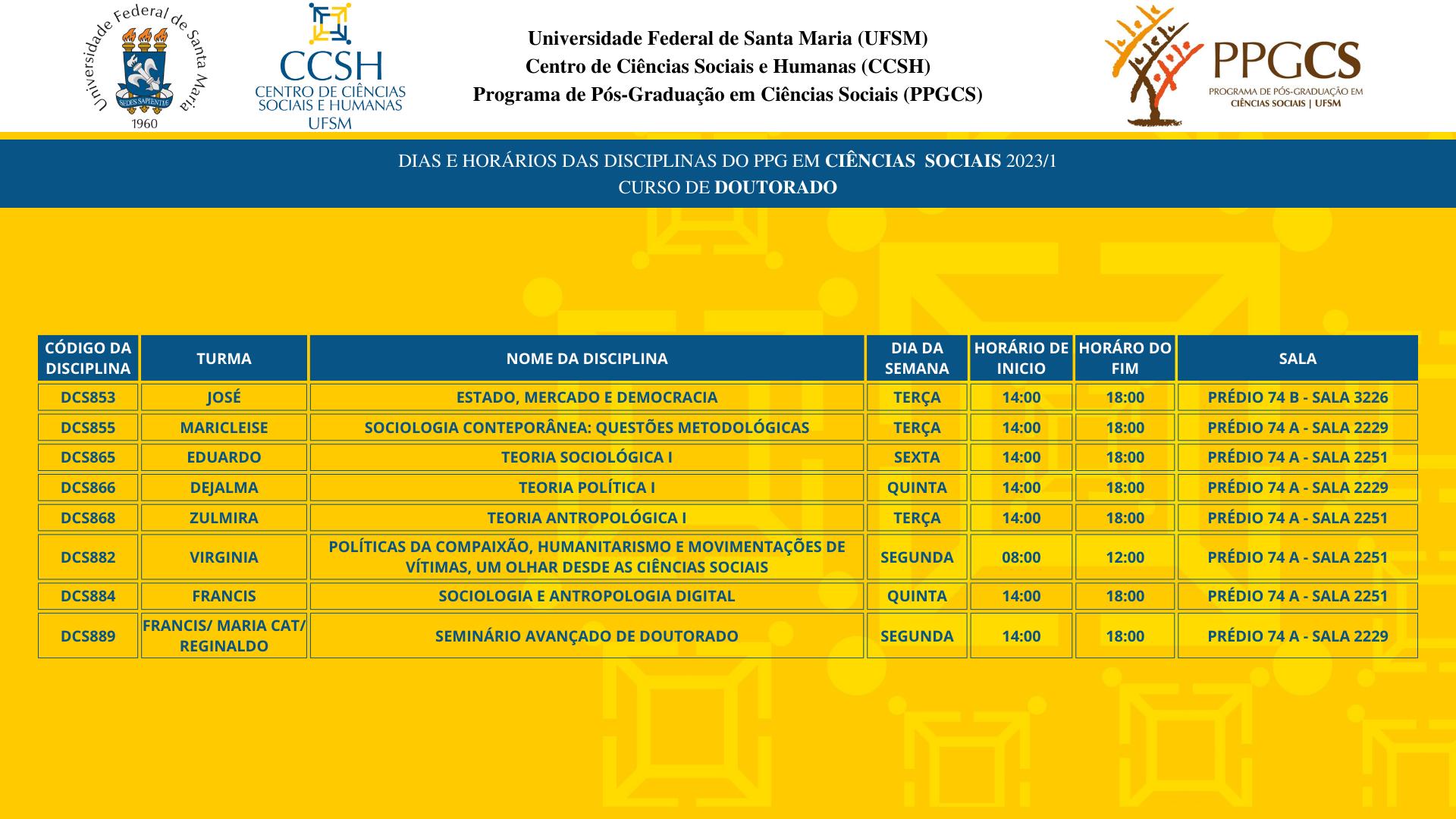 A Coordenação do Programa de Pós-Graduação em Ciências Sociais faz saber ao corpo discente a oferta de disciplinas do 1º semestre letivo de 2023, com respectivos horários e salas de aula.
