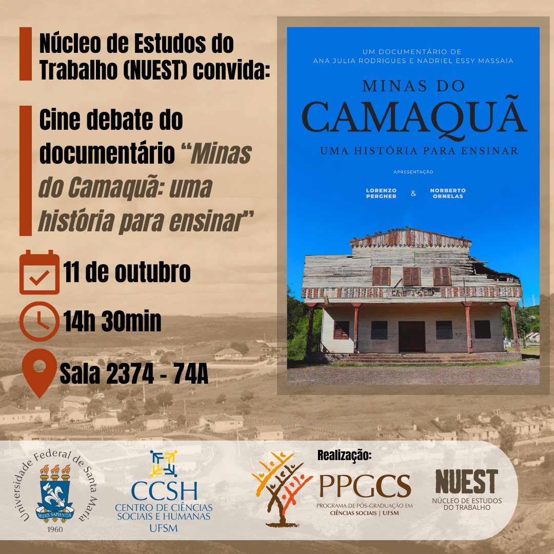 O Programa de Pós-Graduação em Ciências Sociais juntamente com o Núcleo de Estudos do Trabalho (NUEST) convida os/as colegas para um cine debate do documentário “Minas do Camaquã: uma história para ensinar”. Esta produção foi desenvolvida por acadêmicos do curso de Produção Editorial da UFSM, na disciplina de Projeto Experimental em Educação, no ano de 2022. Retrata parte da história do distrito caçapavano, desde a descoberta do cobre, passando por ciclos estrangeiros de exploração, período de pesquisas, a icônica gestão de Francisco Matarazzo Pignatari, até o encerramento da extração mineral. Um dos apresentadores é o mestrando do PPGCS Norberto Ornelas, que pesquisa o caso de Minas do Camaquã sob a perspectiva da Sociologia do Trabalho, e é orientado pela Profª Drª Laura Senna Ferreira. Será uma oportunidade de discutirmos a produção, o caso, e a pesquisa.