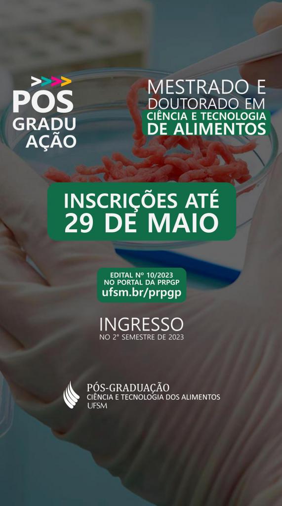 A Coordenação do Programa de Pós-Graduação em Ciência e Tecnologia dos Alimentos (PPGCTA) e a Pró-Reitora de Pós-graduação e Pesquisa (PRPGP) tornam público o Edital 010/2023 – Processo Seletivo de Pós-graduação – Ingresso no 2º semestre de 2023, em nível de Doutorado e Mestrado. As informações sobre o edital geral devem ser acessadas clicando aqui. Atenção neste link, pois as retificações serão publicadas nesta página.