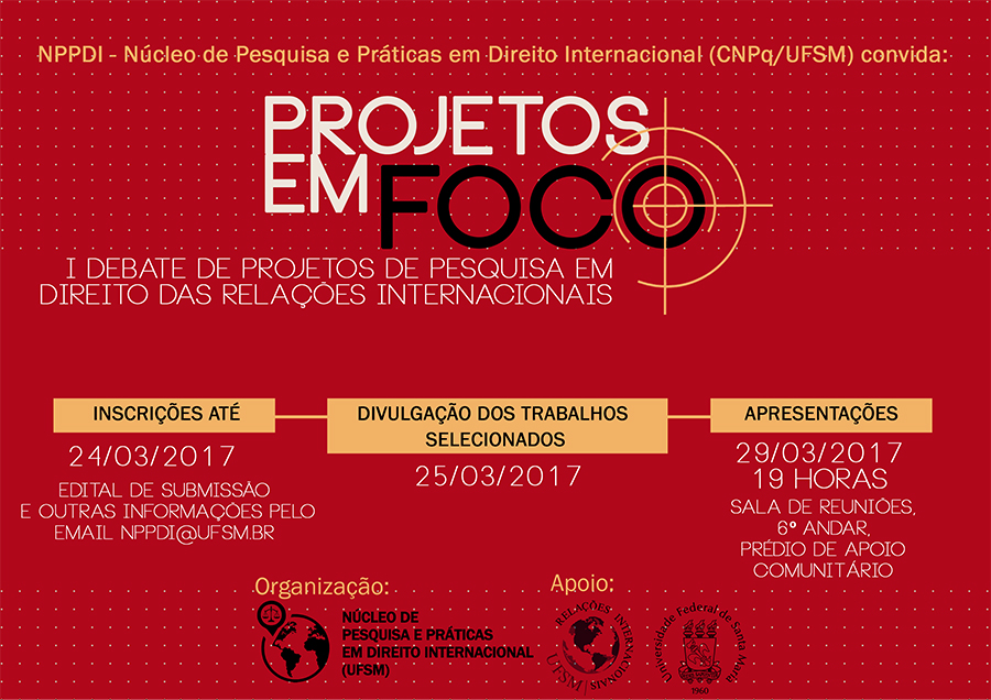 No dia 29 de março de 2017 será realizado o I Projetos em Foco organizado pelo NPPDI – Núcleo de Pesquisa e Práticas em Direito Internacional (CNPq/UFSM).