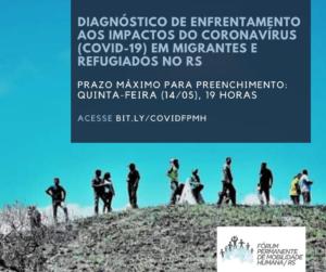 Por iniciativa do Fórum Permanente de Mobilidade Humana do RS, o Migraidh/CSVM DA UFSM, juntamente com Centro Scalabriniano de Estudos Migratórios de Brasília (CSEM-DF) e o Fórum Permanente de Mobilidade Humana de Passo Fundo, RS, realizaram na última semana (13 a 14 de maio) a pesquisa voltada ao Diagnóstico para o Enfrentamento dos Impactos do Coronavírus (COVID-19) na População Migrante e Refugiada no RS.