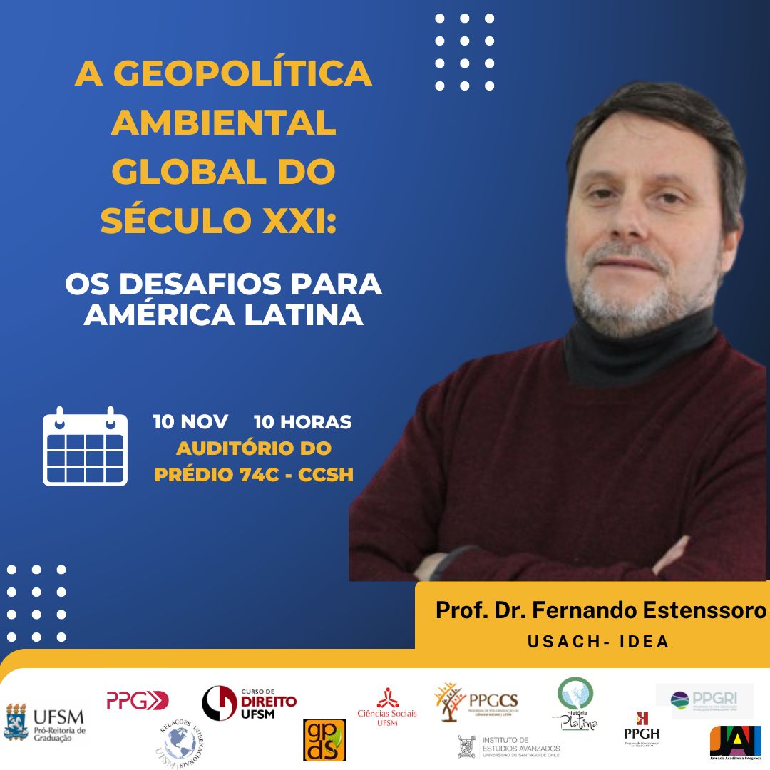 A palestra Geopolítica Ambiental Global do Século XXI: Os Desafios para Amérca Latina é um evento colaborativo entre o IDEA – USACH (Universidad de Santiago de Chile), Pró-reitoria de Graduação (UFSM), Cursos de Direito, Ciências Sociais e Relações Internacionais da UFSM, Programas de Pós- Graduação em História, Direito, Ciências Sociais e Relações Internacionais e dos Grupos de Pesquisa em História Platina e Direitos da Sociobiodiversidade.