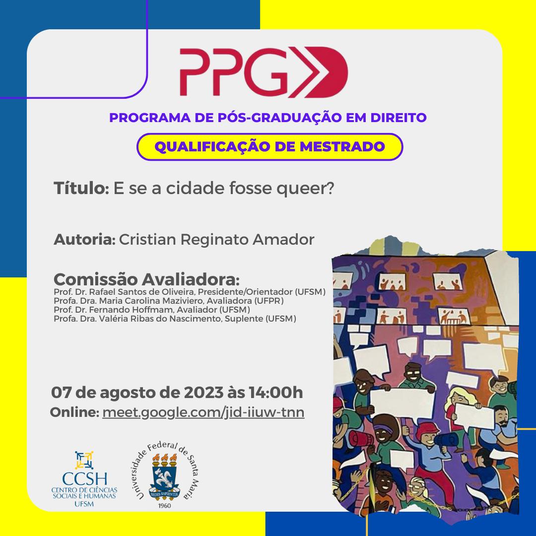 O Programa de Pós-Graduação em Direito divulga a banca de qualificação de mestrado do aluno Cristian Reginato Amador, com o título “E se a cidade fosse queer?” que ocorrerá no dia 7 de agosto de 2023, às 14 horas, na UFSM ou pelo Google Meet: https://meet.google.com/jid-iiuw-tnn.