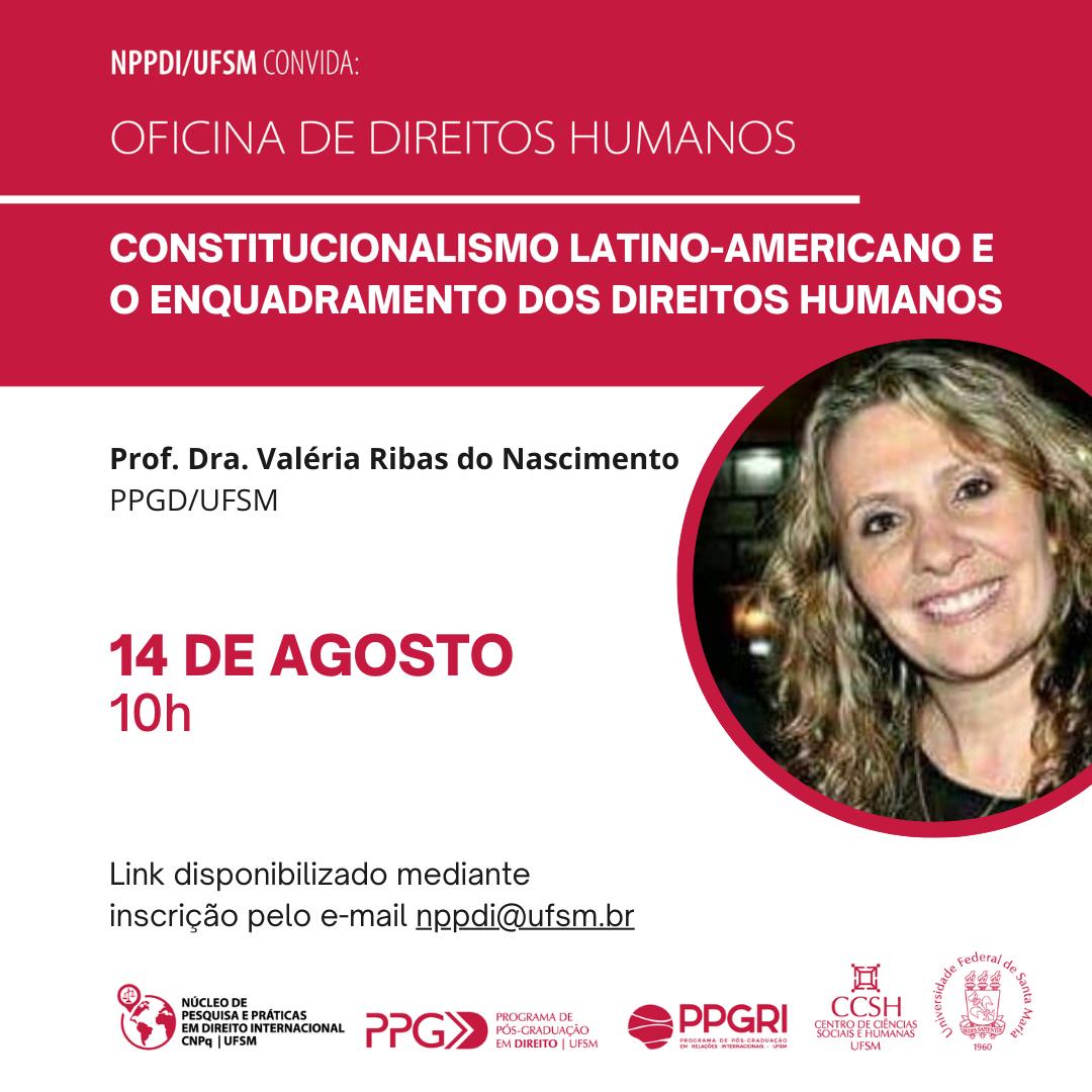 O constitucionalismo latino-americano transcende construções constitucionais clássicas ao promover um tratamento diferenciado de demandas historicamente excluídas do jogo político, dentre elas as dos povos indígenas e as demandas pela proteção da sociobiodiversidade. Nesse sentido, o constitucionalismo latino-americano insere-se no contexto de uma virada decolonial e ressignifica a proteção dos direitos humanos fundamentais. Esta Oficina de Direitos Humanos, conduzida pela Prof. Dra. Valéria Ribas do Nascimento (PPGD/UFSM), tem o intuito de discutir os aspectos teóricos desse enquadramento local dos direitos humanos e das novas subjetividades e culturas de direitos que dele decorrem.