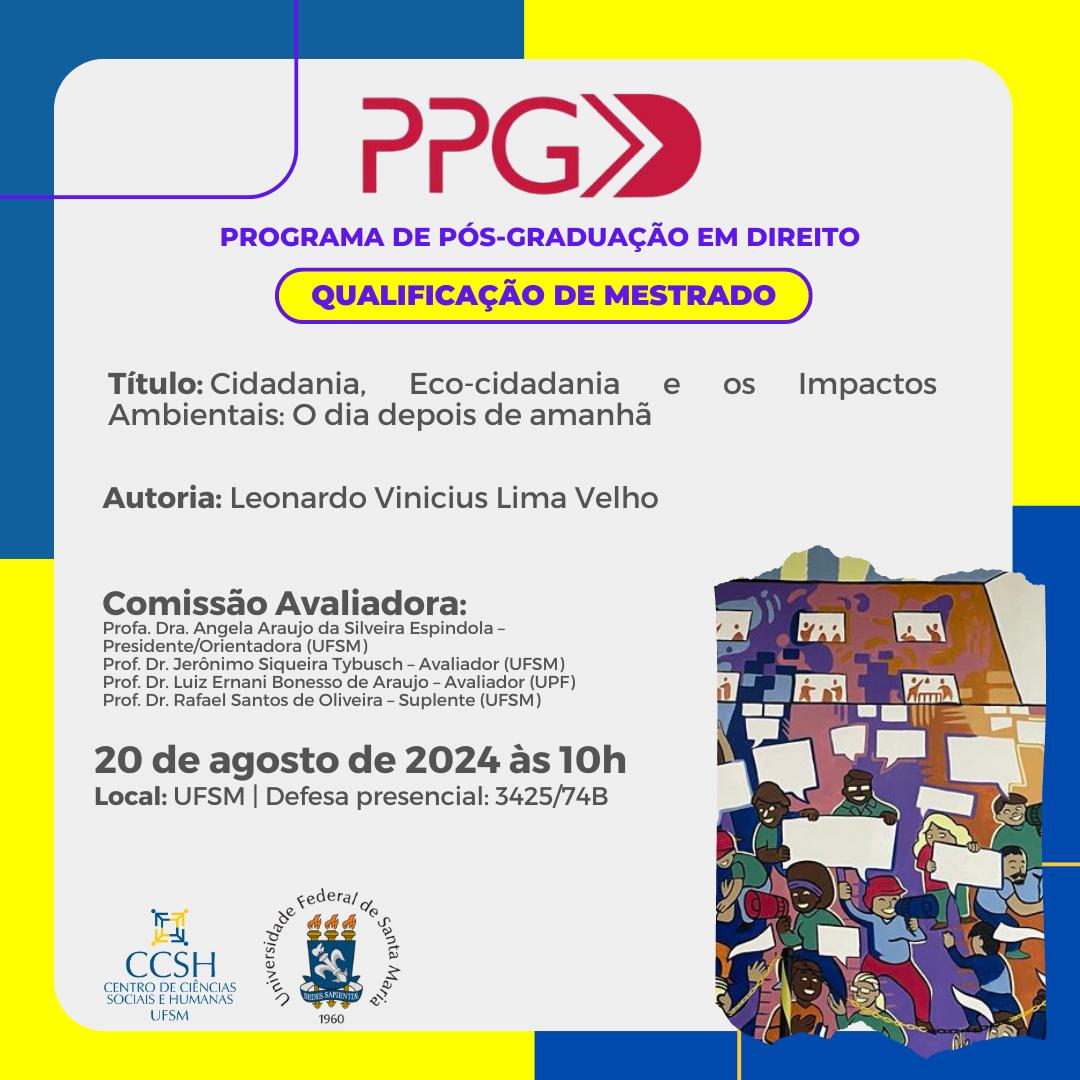 O Programa de Pós-Graduação em Direito divulga a banca de qualificação de mestrado do aluno Leonardo Vinicius Lima Velho, com o título “Cidadania, Eco-cidadania e os Impactos Ambientais: O dia depois de amanhã”, que ocorrerá no dia 20 de agosto de 2024, às 10h na UFSM | Defesa presencial: 3425/74B .