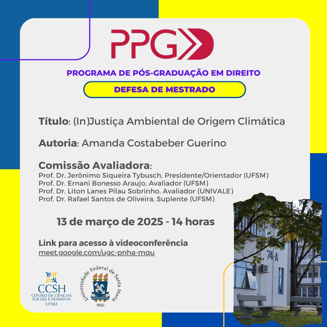 O Programa de Pós-Graduação em Direito divulga a defesa de mestrado da aluna Amanda Costabeber Guerino, com o título “(In)Justiça Ambiental de Origem Climática”, que ocorrerá no dia 13 de março de 2025, às 14 horas.