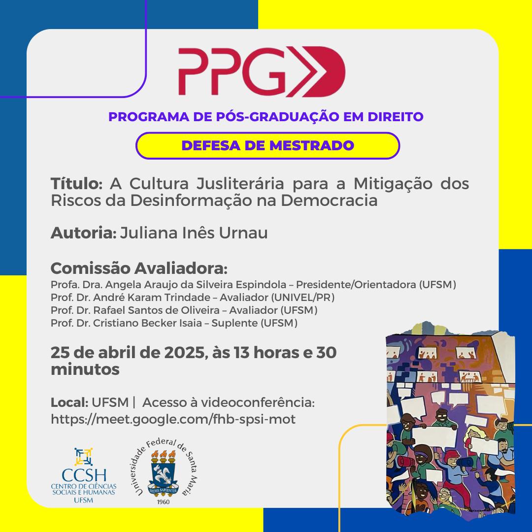 O Programa de Pós-Graduação em Direito divulga a defesa de mestrado da aluna Juliana Inês Urnau, com o título “A Cultura Jusliterária para a Mitigação dos Riscos da Desinformação na Democracia”, que ocorrerá no dia 25 de abril de 2025, às 13 horas e 30 minutos por videoconferência, acesso pelo link: https://meet.google.com/fhb-spsi-mot