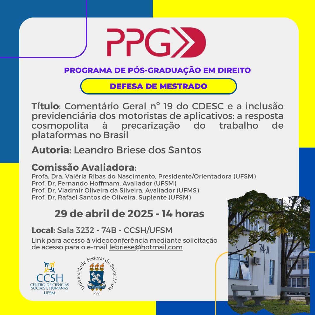 O Programa de Pós-Graduação em Direito divulga a defesa de mestrado do aluno Leandro Briese dos Santos, com o título “Comentário Geral nº 19 do CDESC e a inclusão previdenciária dos motoristas de aplicativos: a resposta cosmopolita à precarização do trabalho de plataformas no Brasil”, que ocorrerá no dia 29 de abril de 2025, às 14 horas, na sala 3232 do prédio 74B, CCSH/UFSM, e de forma online.