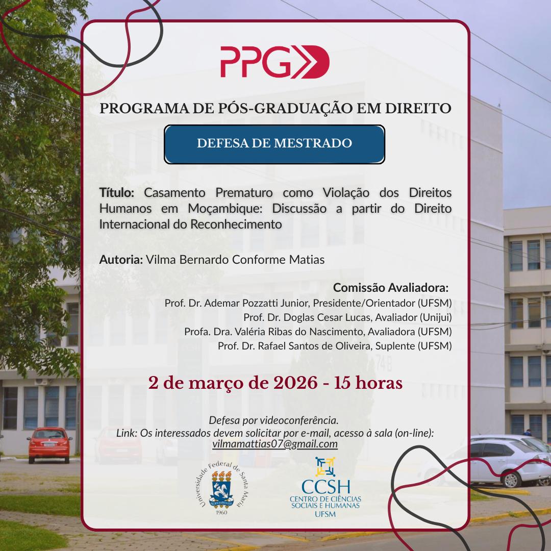 O Programa de Pós-Graduação em Direito divulga a defesa de mestrado da aluna Vilma Bernardo Conforme Matias, com o título “Casamento Prematuro como Violação dos Direitos Humanos em Moçambique: Discussão a partir do Direito Internacional do Reconhecimento”, que ocorrerá no dia 2 de março de 2026, às 15 horas, de forma online. Acesso à videoconferência mediante solicitação por e-mail: vilmamattias07@gmail.com.
