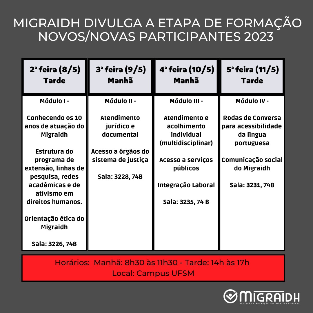 Seleção para bolsas de atuação no Migraidh – Edital ODH 2024Estão abertas as inscrições para duas bolsas de atuação no Migraidh, custeadas por meio do Edital 009/2024 do ODH/CODERC/PRE/UFSM. As bolsas são [...]